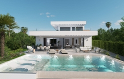Crafted with top-quality materials, the villa features three spacious bedrooms and three fully equipped bathrooms. Enjoy a grand, state-of-the-art kitchen, a modern fireplace, and a BBQ area, complemented by indirect LED lighting throughout. The stunning terrace leads to a fantastic swimming pool and lush garden, highlighting the villa's minimalistic design and large windows that invite abundant natural light.