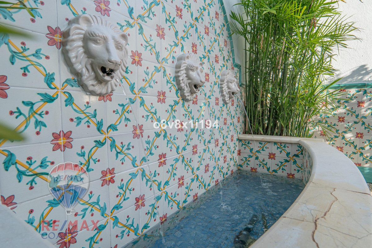 The kitchen opens onto an exquisitely decorated patio—your very own oasis—featuring a wood-fired oven, bar area, and a fountain that adds the soothing sound of water. It's ideal for outdoor dining or simply enjoying the ambiance.