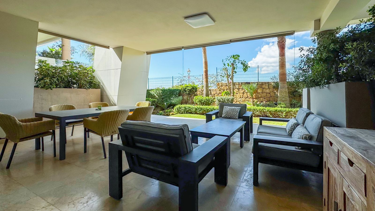 Un appartement de jardin lumineux et élégant à La Montesa de Marbella, où l'architecture moderne rencontre le style de vie décontracté de Cabopino.