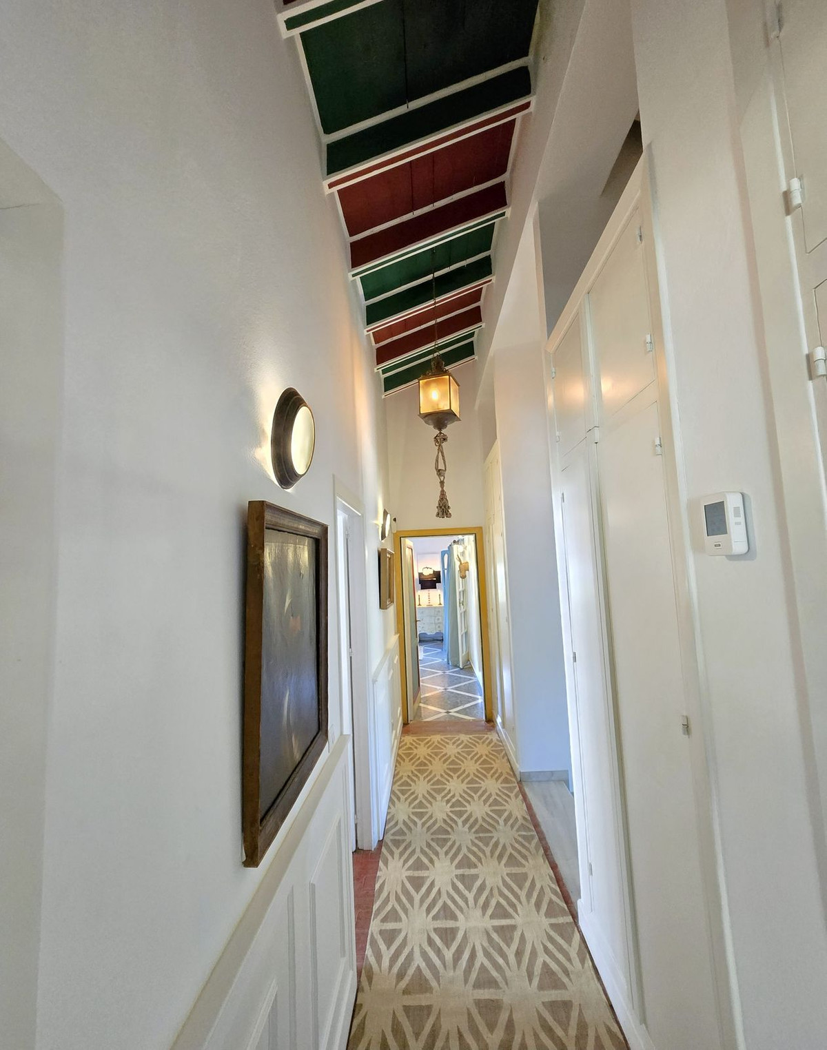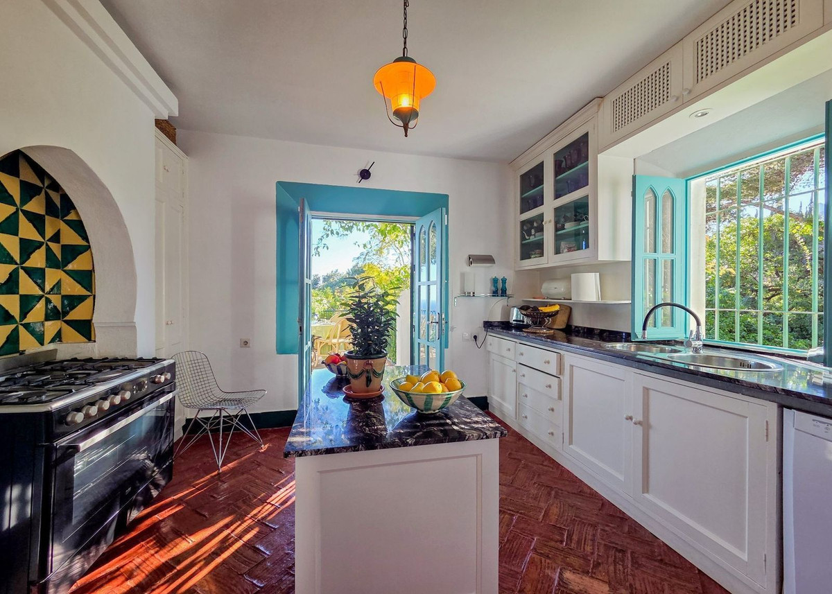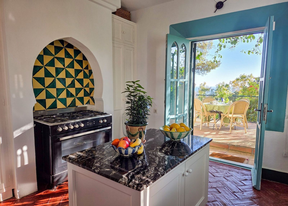 À l'intérieur, un hall d'entrée accueillant aux plafonds en bois mansardés donne le ton à l'élégance de la maison. À gauche, un salon lumineux et aéré, avec cheminée, baigne de lumière, créant une atmosphère chaleureuse et accueillante. La cuisine, pleine de caractère et aux couleurs vibrantes, s'ouvre sur une spectaculaire terrasse suspendue offrant une vue imprenable sur la mer, joliment encadrée par des bougainvilliers et des jacarandas – un endroit idéal pour savourer des repas en plein air ou simplement s'imprégner de l'atmosphère méditerranéenne.