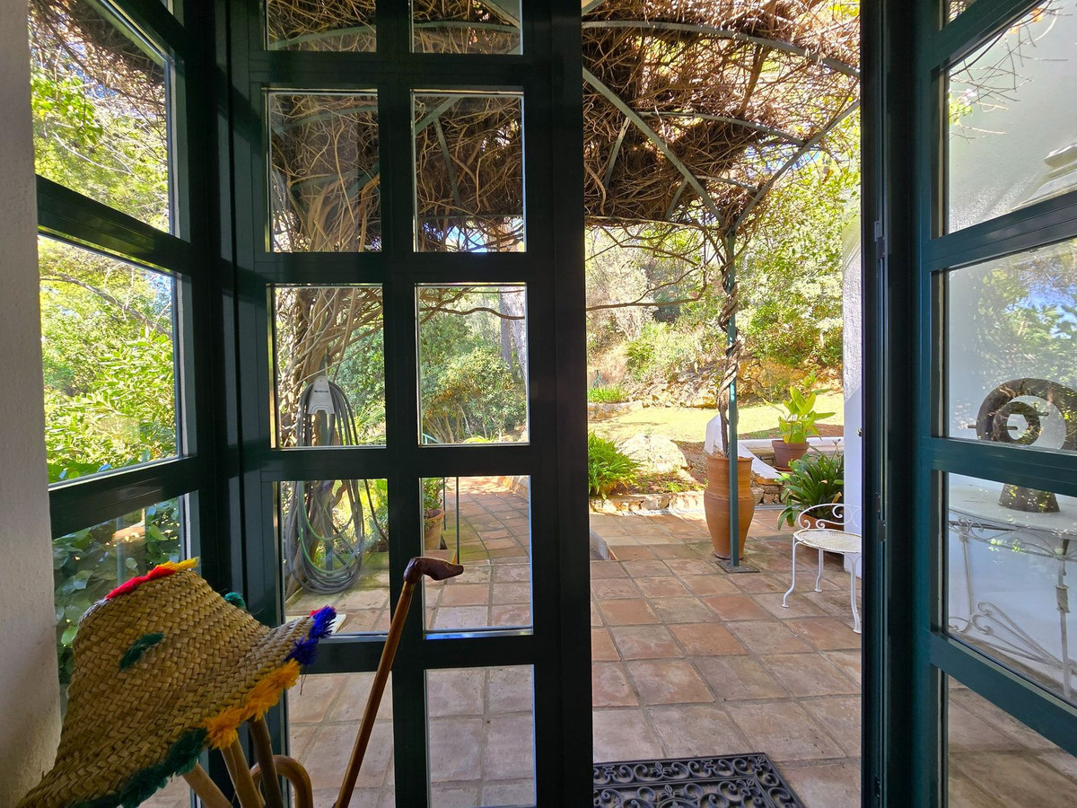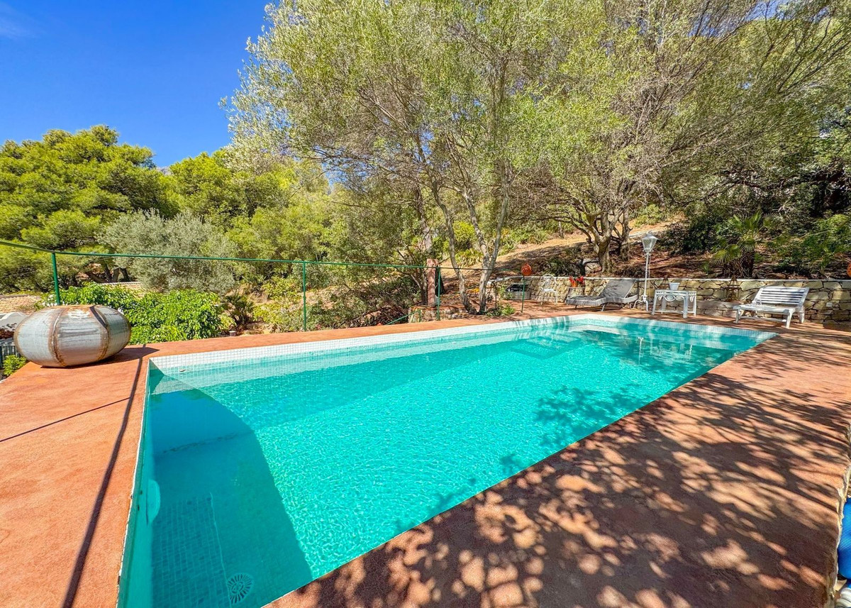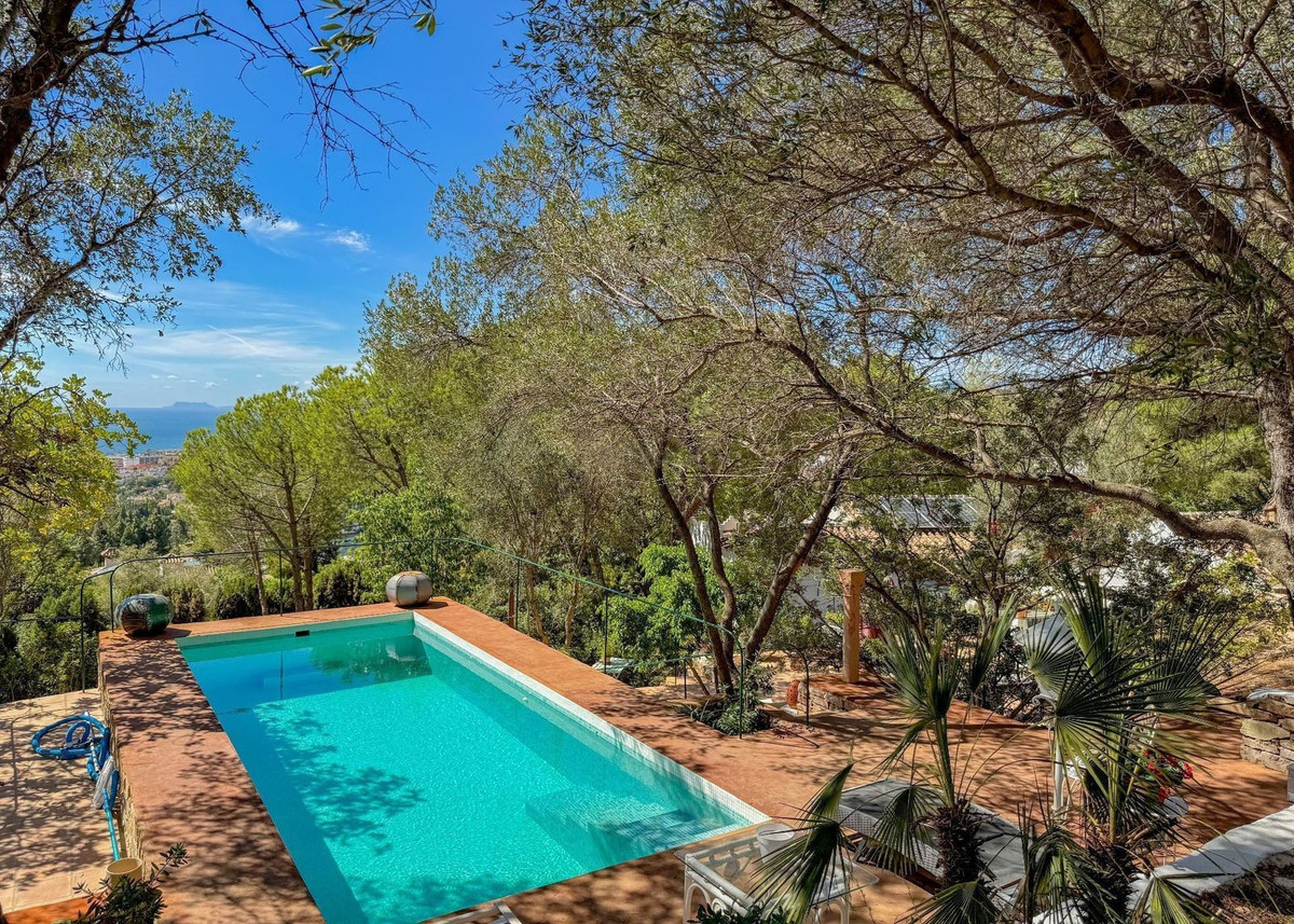 La piscine de la villa, véritable joyau, offre une vue imprenable sur la mer, qui s'étend jusqu'à Gibraltar et les lointaines côtes marocaines. Entourée de caroubiers matures, elle vous invite à la détente dans sa beauté sereine, tandis que le salon d'été adjacent vous promet des moments inoubliables de détente et de divertissement en plein air.