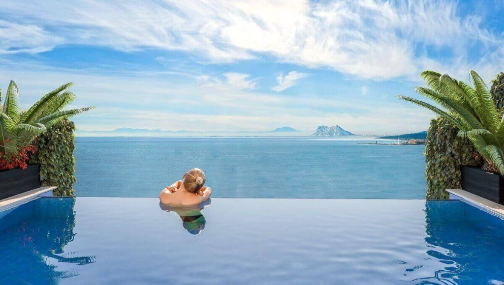 Uitzicht: zee, bergen, strand, zwembad