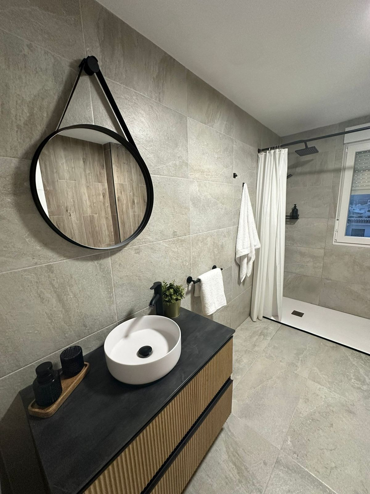 A 9-square-meter bathroom has been completely renovated and is spa-like.