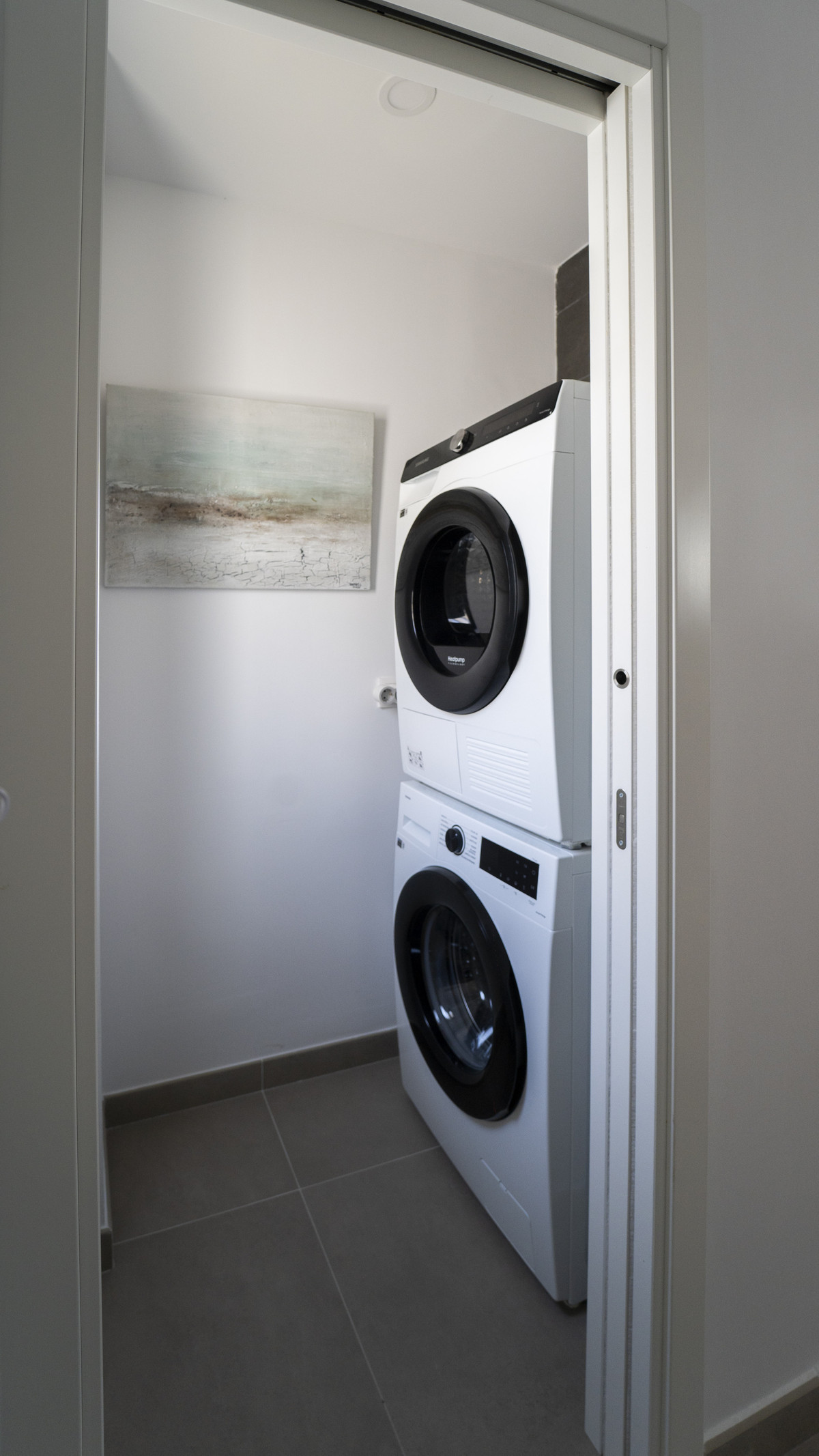 The ground floor boasts a spacious living area that opens directly onto a private terrace, ideal for relaxing or entertaining guests. The contemporary kitchen is fully integrated into the living space, and there's also a separate laundry area equipped with a washing machine and dryer for added convenience. The home offers a total of three bedrooms and two bathrooms, designed to comfortably accommodate families, couples, or groups.