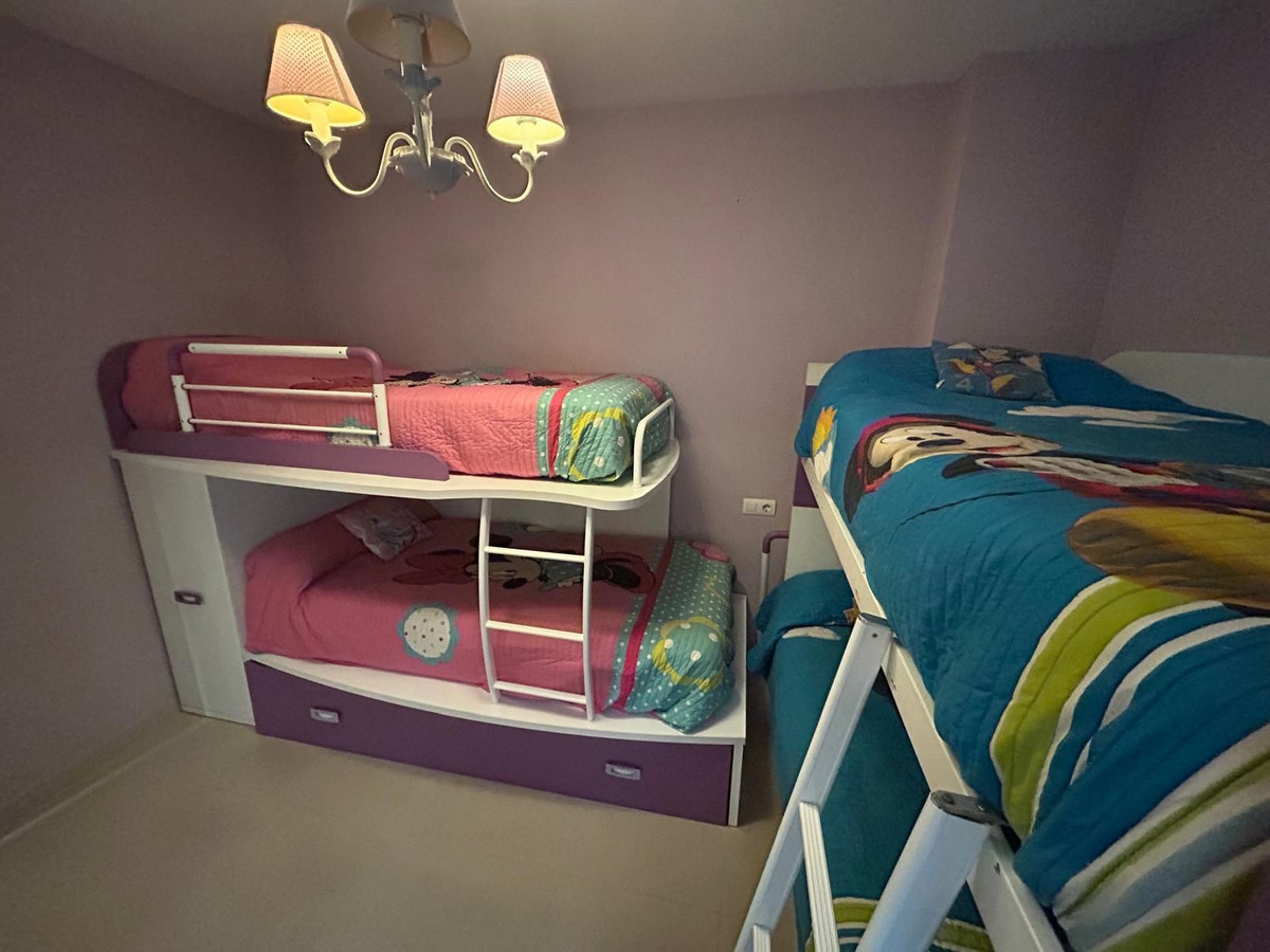 Ground floor apartment for sale, 66 m², in Fuengirola, Málaga. This apartment is just 100 meters from El Galgo beach (port area) and 100 meters from the heart of Fuengirola (Plaza La Constitución). It enjoys a prime location surrounded by shops, restaurants, and all kinds of amenities. The bus station is 150 meters away and the train station just 200 meters away. The apartment has air conditioning throughout. It features a full bathroom with shower and a window overlooking the patio, a spacious living room with two windows, an open-plan kitchen with appliances and all furnishings, a master bedroom with air conditioning and a window, and a second bedroom with two bunk beds plus a trundle bed, comfortably sleeping 5 people. It also includes wardrobes and a built-in wardrobe. There is a semi-covered patio with a laundry area. The price includes a private parking space and a storage room in the same building.