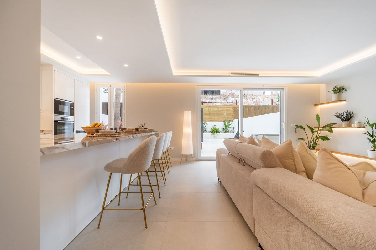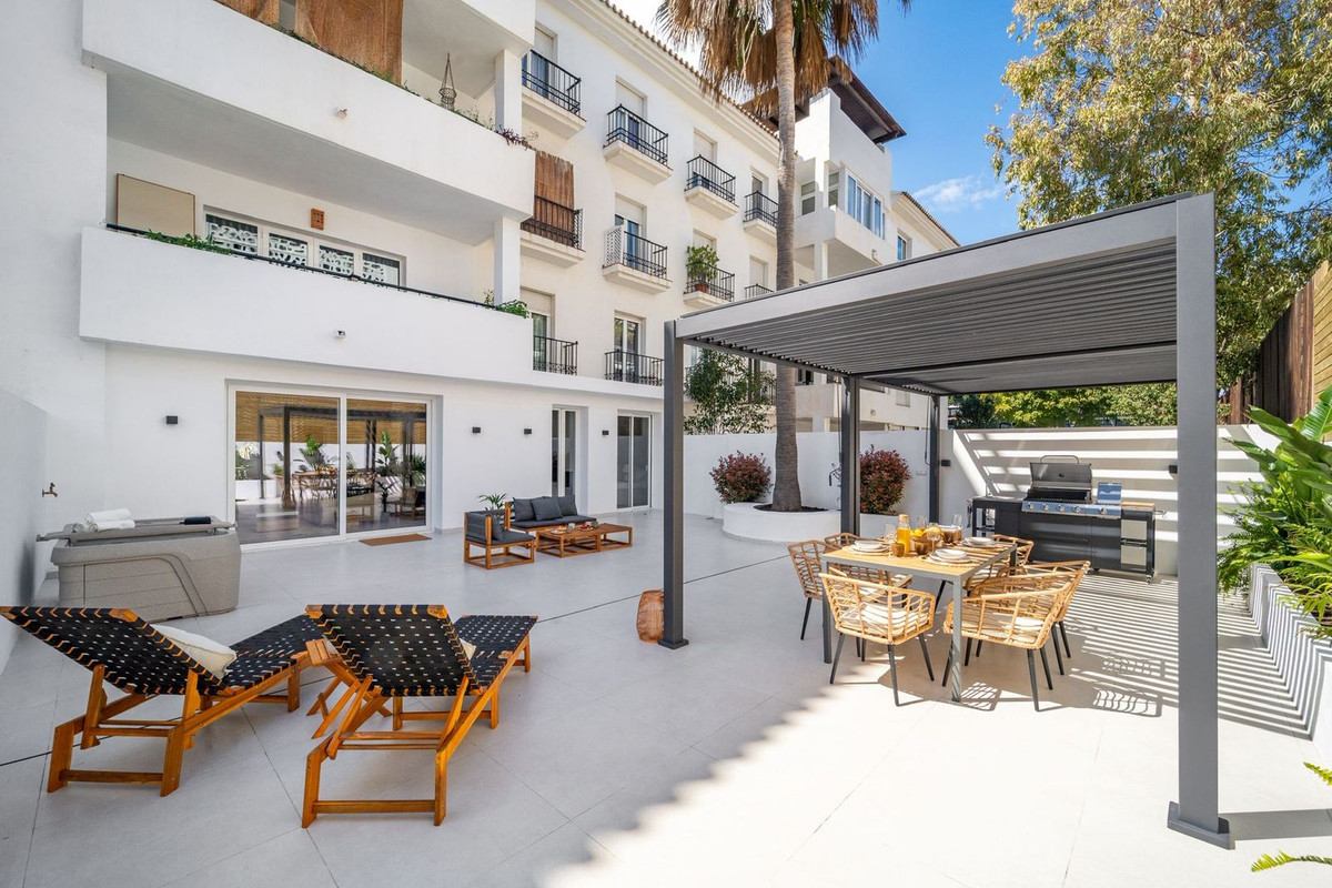 Experience luxurious living in this stunning newly refurbished ground floor apartment, located in the prime area of Marbella Nueva Andalucía, just a short walk to Puerto Banús. This sleek and modern property features three spacious bedrooms, each with its own en-suite bathroom, offering ultimate comfort and privacy. Additionally, there is a stylish guest toilet for visitors. The contemporary design combines elegance with functionality, creating a sophisticated atmosphere perfect for enjoying the Marbella lifestyle. The private garden provides breathtaking mountain views and is perfect for entertaining or relaxing in style, complete with a private hot tub and outdoor kitchen. Whether you're unwinding on the spacious terrace or exploring the vibrant nearby marina, this penthouse offers an unparalleled combination of location, luxury, and modern comfort.