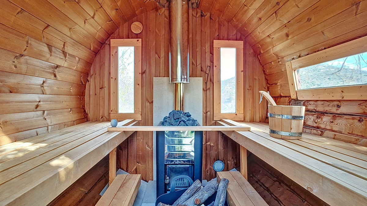 The terrace surrounding the house is surrounded by beautiful planting and trees, the views over the Mediterranean are phenomenal. The large swimming pool (7m by 10m) is lovely for your daily swim. The wood-heated sauna is ideal for relaxing combined with the stunning views.