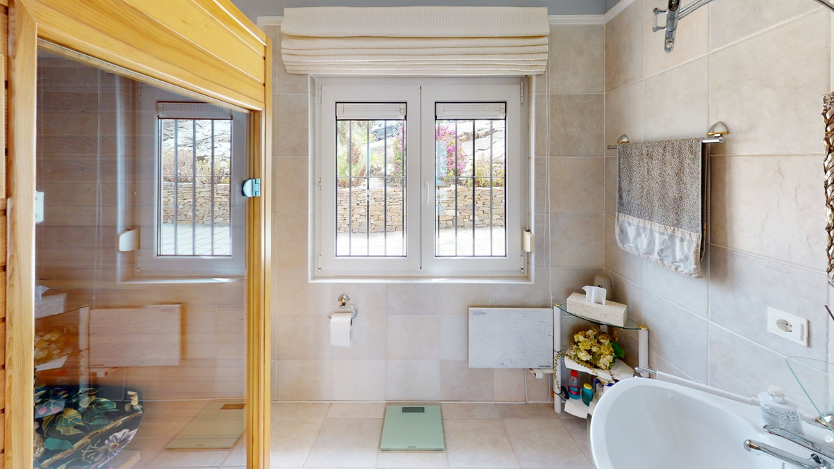 If it ́s your dream to live in a fantastic, high quality built villa with a pool and breathtaking sea views, then you have found the right property. This 280 m2 luxury villa offers everything you could possibly want. In the centre of the modern villa mixed with Andalusian style is a charming patio, which gives the house a special accent and provides beautiful lighting and atmosphere. It links the entire lower area of the property. From the entrance area, one side leads to a room used as an office, as well as a bedroom with an on-suite bathroom and the spacious living room with a fireplace and sea views. This in turn is adjacent to the dining area and the kitchen, from which you enter the hallway that is connected to the entrance area. This hallway also leads to the dressing room with an on-suite bathroom, where there is a sauna. Stairs lead from the entrance to the second floor. Here you will find the large master bedroom with an on-suite bathroom and a winter garden. External stairs lead to the outdoor area, which gives this room a separate entrance. The wonderful outdoor area offers a double garage, as well as a laundry room, which is also used for storage. Right next to the inviting pool is a gym with bathroom, as well as a glass fronted annex that serves as a lounge area with an outdoor kitchen. The perfect place for celebrations and dinners with family and friends. On the 19,500 m2 property there is also a paddock, with shelter and its own driveway, for keeping horses. It ́s located below the house. The driveway also leads to a small riding arena with three horse stalls, a tack room and a shower for the horses. You have free design possibilities of the spacious property. Whether it is to plant a fruit and vegetable garden, expand the area of horse keeping, possibly convert the riding arena to a tennis court, volleyball or small soccer field, even something completely new. The choice is entirely up to you. We are pleased to be able to present this dream property to you soon, either personally or via virtual viewing. Because this world is unique - just like our Axarquía. In Andalusia. On the Costa del Sol. Here, on the sunny side of life...