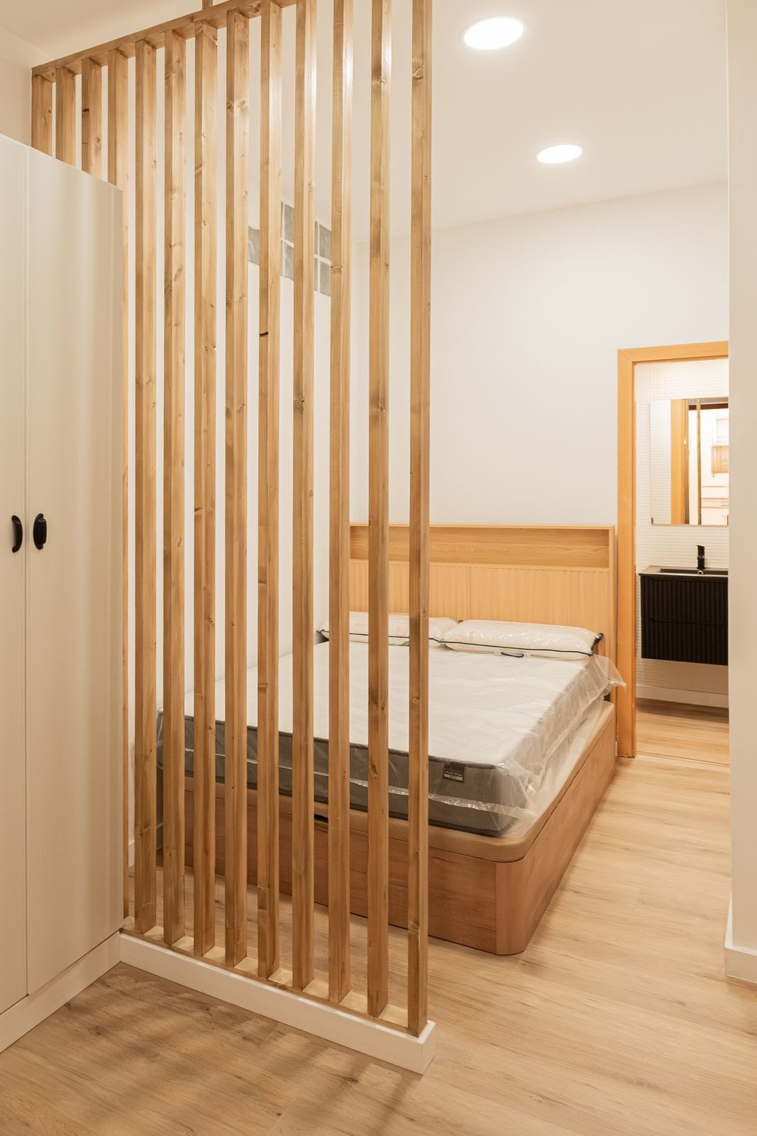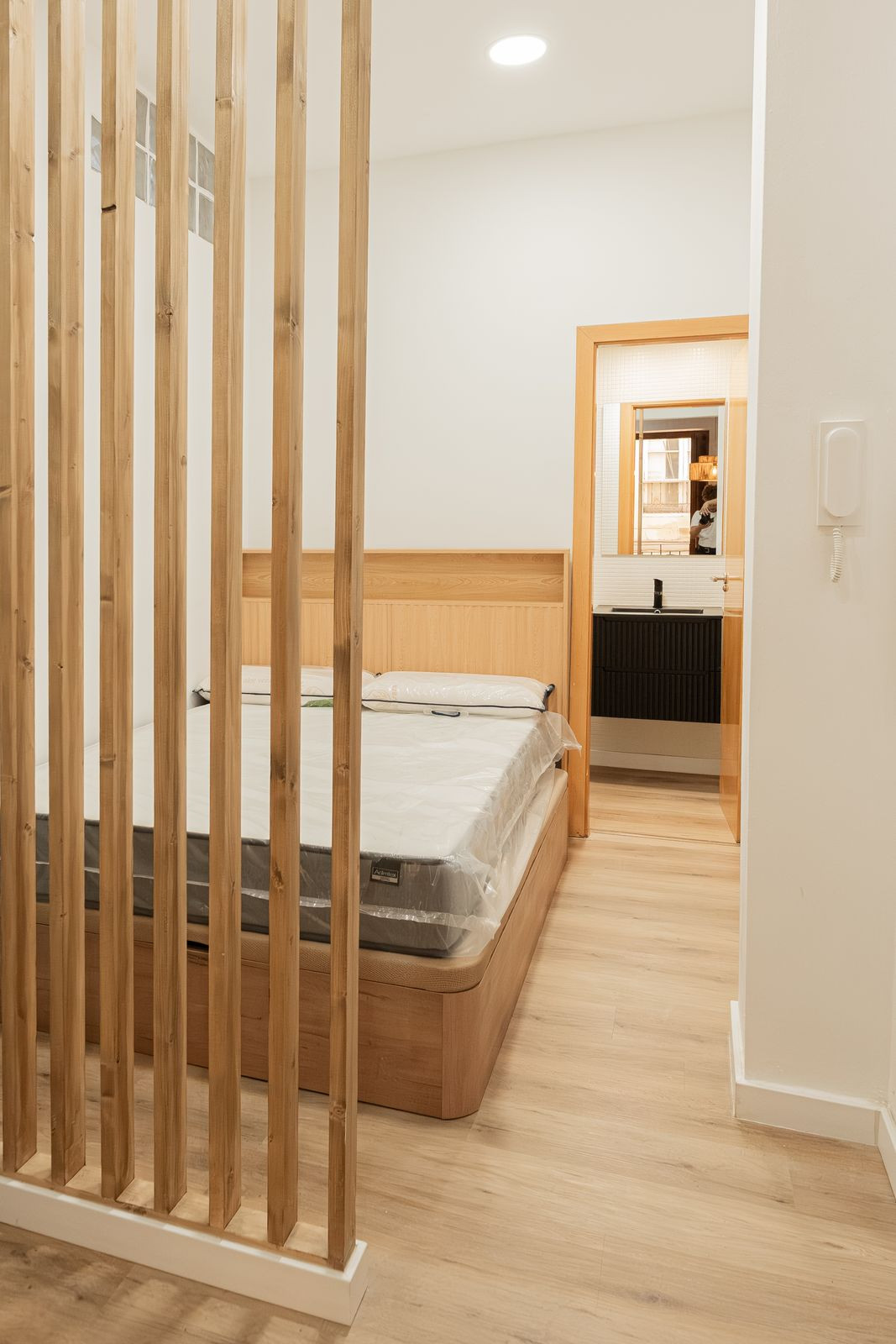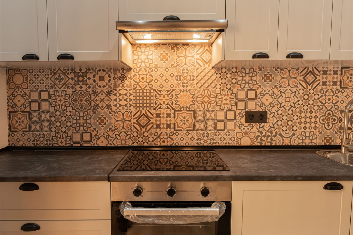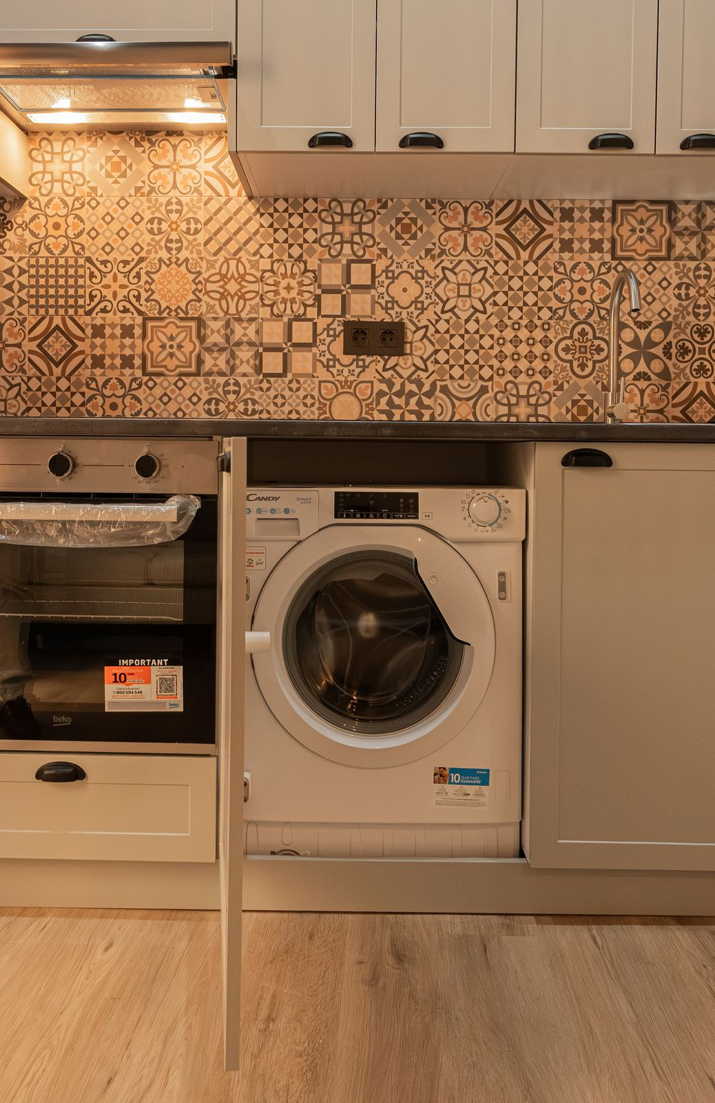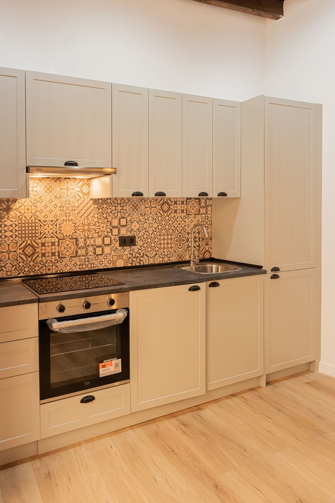 La cuisine, entièrement neuve et conçue sur mesure pour ce bien, comprend une hotte aspirante, une plaque de cuisson vitrocéramique, un four, un lave-linge séchant et un réfrigérateur intégré — le tout neuf et jamais utilisé, et inclus dans le prix. Le mobilier du salon et de la chambre est également neuf et jamais utilisé.