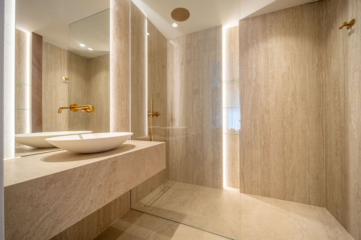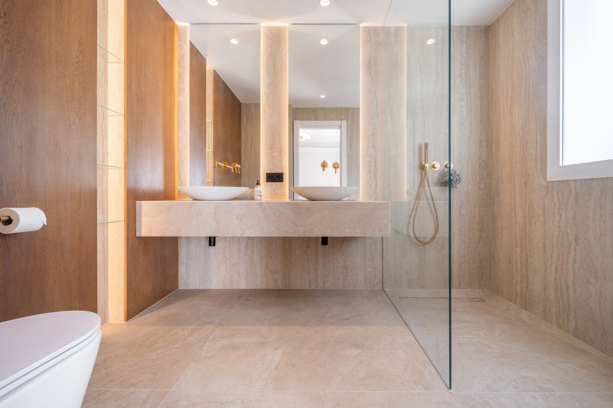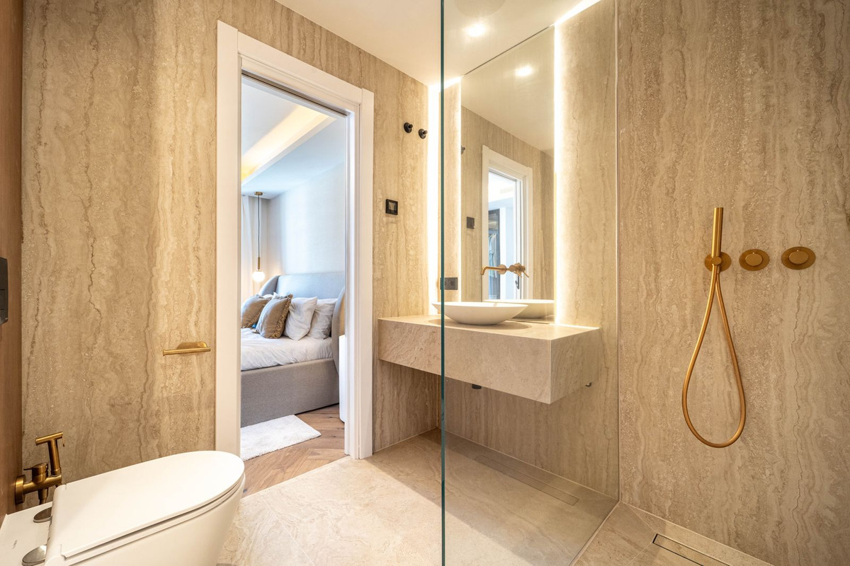 En accédant à la chambre principale de la maison, vous découvrirez une vaste suite parentale avec un dressing quadruple assorti à celui de l'autre chambre. Ce dressing a été soigneusement conçu pour offrir suffisamment d'espace de rangement pour une variété de vêtements, y compris un présentoir à sacs dédié sur le côté droit. Cette chambre bénéficie d'une terrasse privée offrant une vue imprenable sur le golf de Las Brisas. La salle de bains attenante à la chambre principale, conçue avec le même raffinement que les autres chambres, se distingue par un espace accru, des boiseries en chêne massif plus nombreuses et une luminosité naturelle optimale grâce à l'entrée arrière de la propriété. Elle est également équipée d'une double vasque sur le meuble-lavabo.